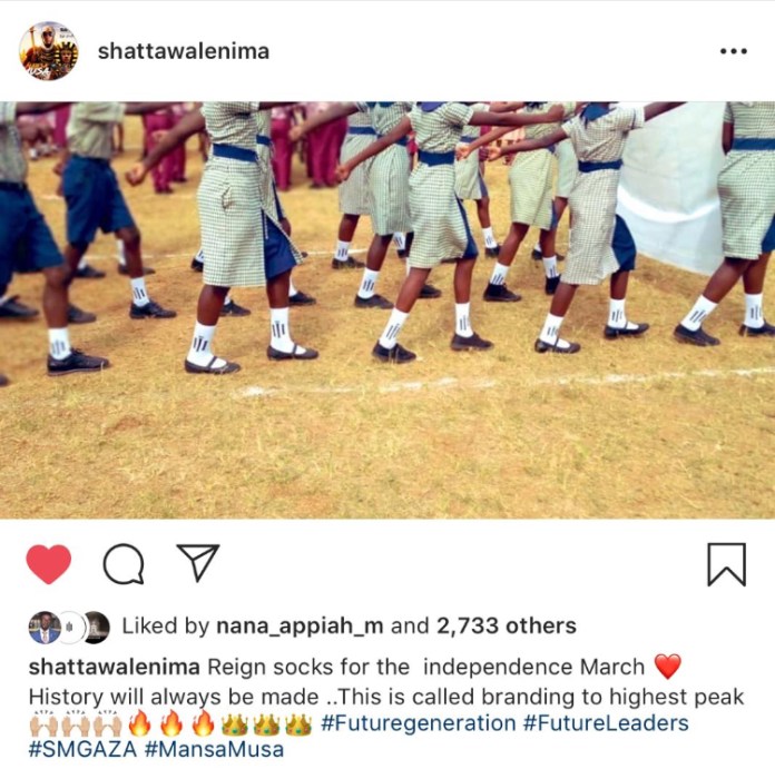 A photo of school children marching in Shatta Wale’s branded ‘Reign’ socks at Ghana’s 63rd Independence Anniversary surfaced earlier today on the internet