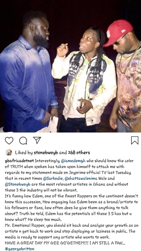 Ghanaian blogger and artists manager, George Britton is fighting Ghanaian rapper Edem over ‘Ghana music will collapse without Stonebwoy, Shatta Wale and Sarkodie’ comment he (George) made.