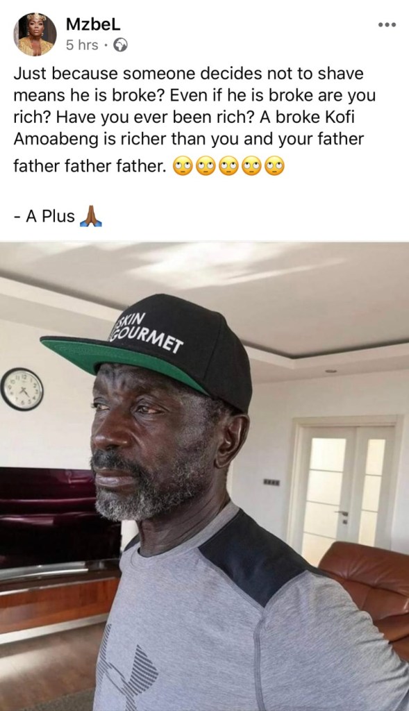 Mzbel reiterated A-Plus’ comment that a broke Kofi Amoabeng is richer than the fathers of most of the people criticising him adding that Kofi Amoabeng not shaving his beard doesn’t make him ‘broke’.