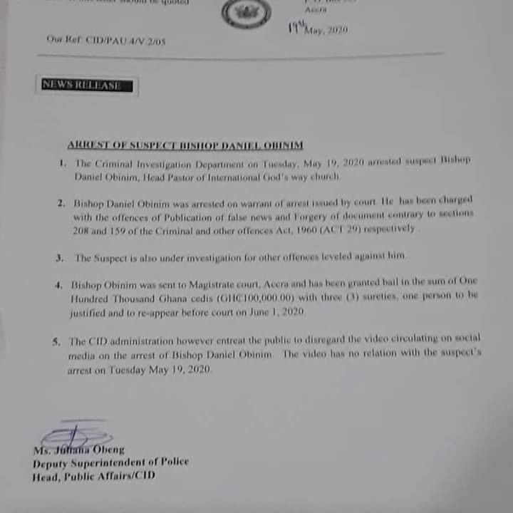 The Criminal Investigation Department (CID) of the Ghana Police Service on Tuesday, May 19 arrested Bishop Daniel Obinim and charged him with forgery and publication of false news.