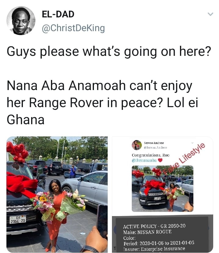 A twitter user by name EL-DAD in a tweet hit at netizens calling Nana Aba’s gift fake. He tweeted, ” Guys please what’s going on here? Nana Aba Anamoah can’t enjoy her Range Rover in peace? Lol Ei Ghana”.