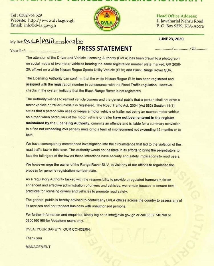 According to the management of DVLA, the registered vehicle in their system with the number plate GR 2050-20 is that of a Nissan Rogue Sports Utility vehicle and not the Range Rover.