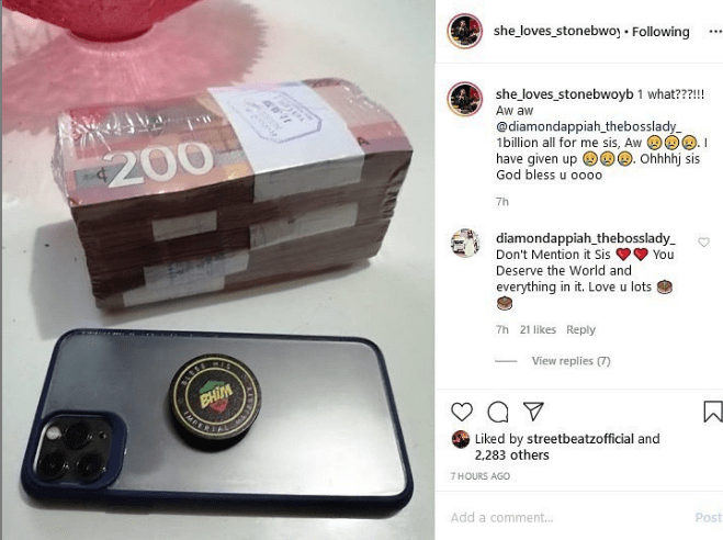 “1 what???!!! Aw aw @diamondappiah_thebosslady_ 1billion all for me sis, Aw . I have given up . Ohh sis God bless u oooo”