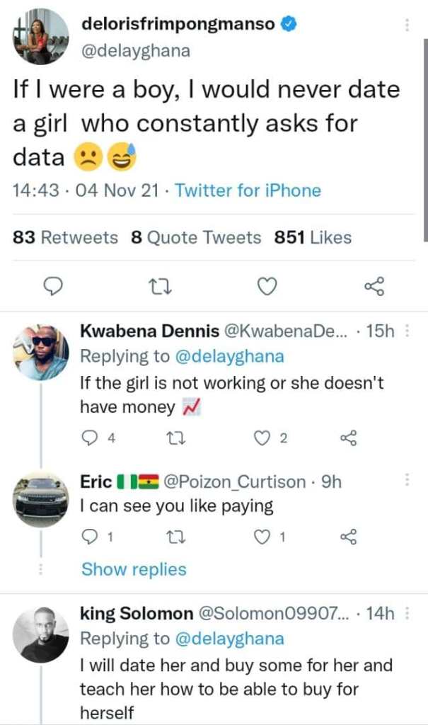 Some netizens reacting to her post gave some suggestions as to how they will treat a lady who constantly asks for data and not ignore them as Delay plans to do if she were a boy saying they will date her and buy the data but then teach her how to buy data for themselves.