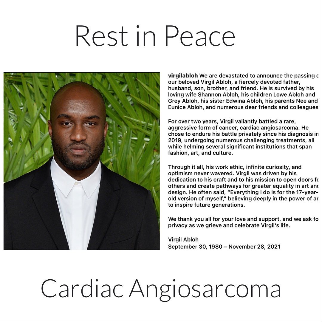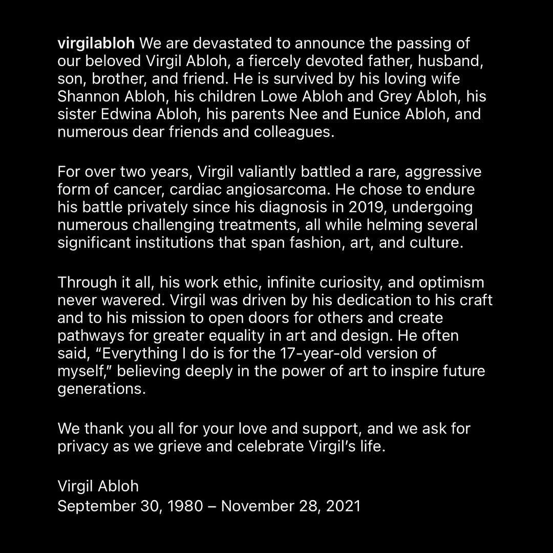 “For over two years, Virgil valiantly battled a rare, aggressive form of cancer, cardiac angiosarcoma. He chose to endure his battle privately since his diagnosis in 2019, undergoing numerous challenging treatments, all while helming several significant institutions that span fashion, art, and culture