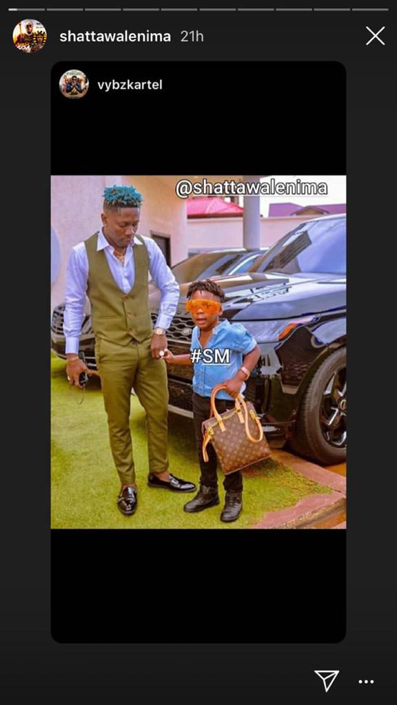 Vybz Kartel in a post on Instagram, shared one of these photos of Shatta Wale and Majesty on his Instastory and mentioned Shatta Wale in it. Shatta Wale upon seeing this massive shout out from the world boss also shared it on his Instastory.